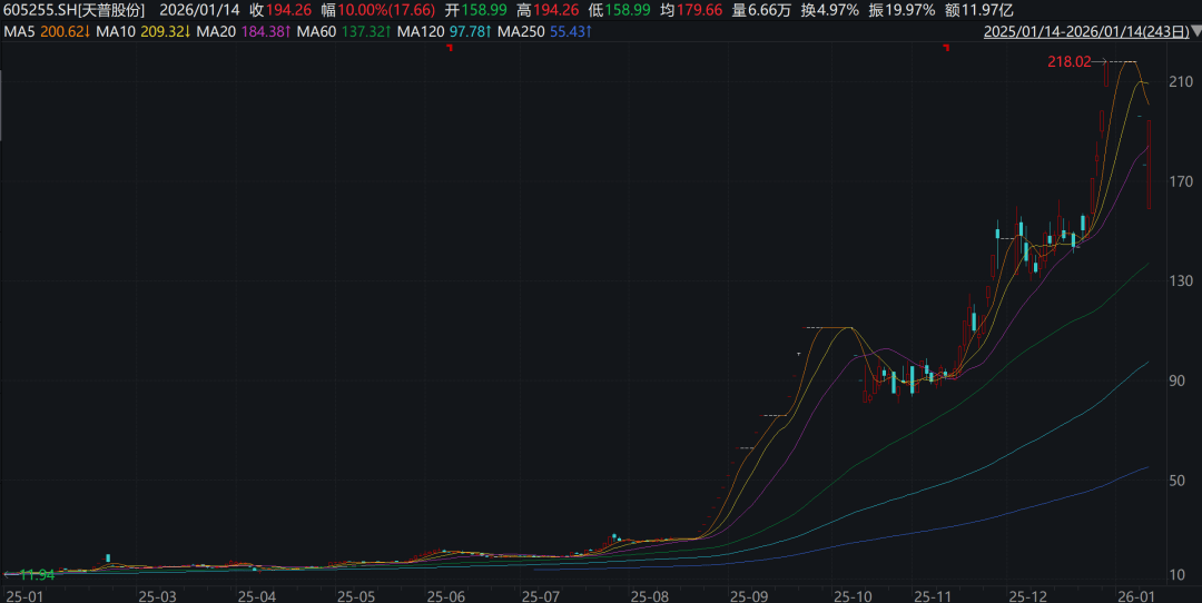 在监管措施接踵而至及公司再三声明下,市场对天普股份的情绪有所收敛。1月12日复牌当日及次日,公司股价两连跌停,截至1月13日报收于176.6元/股。不过1月14日,公司股价再度涨停,截至收盘报194.26元/股,总市值为260亿元。