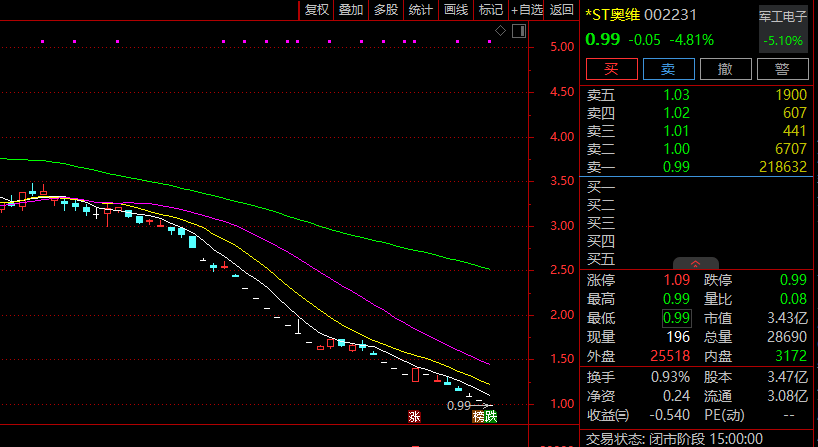 值得一提的是,*ST奥维2025年12月31日收盘价为1.4元/股,总市值为4.86亿元,低于5亿元。为此,*ST奥维在1月4日晚就曾发布风险提示公告,若公司股票连续二十个交易日收盘总市值均低于5亿元,公司股票将被深交所终止上市交易。