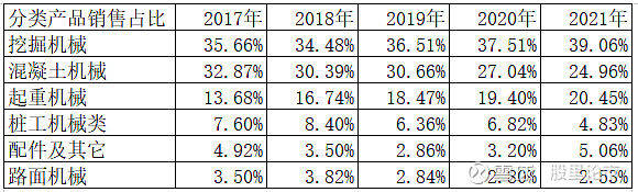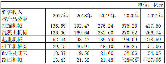 3)起重机械,2017年至2021年,起重机销售收入分别是52.43亿元、93.47亿元、139.7亿元、194.1亿元、218.59亿元。具体原因:a)起重机市场份额持续提高,特别是大中型履带起重机、汽车起重机表现优异;b)风电市场快速发展。