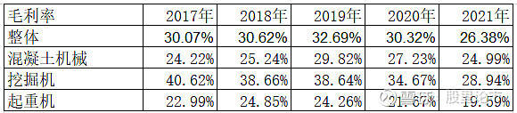 1)混凝土机械,2017年-2021年销售收入分别是126亿元、169.64亿元、232亿元、270.5亿元,266.74亿元,呈现快速成长的趋势,主要原因是:a)公司是全球第一混凝土机械品牌,市场份额提高,b)2016年-2019年,基建投资增长、房地产新开工面积恢复正增长;c)上一轮工程机械高景气是2009年-2011年,工程机械使用寿命7-10年,2016年后也是新旧机器替换的的高峰期;d)2020年起,房地产开发受政策及疫情影响,出现负增长,再加上基础设施同期增速大幅下降,导致2021年销售同比下降。