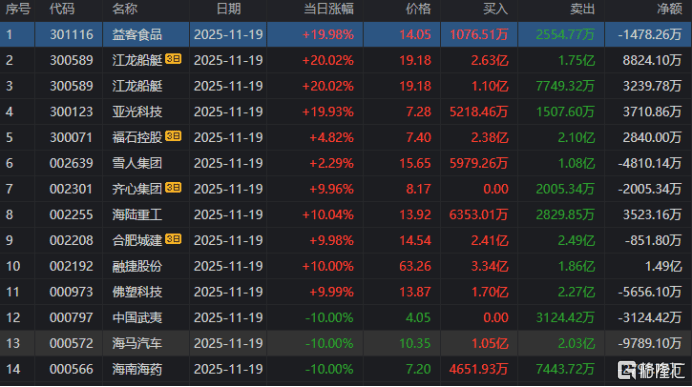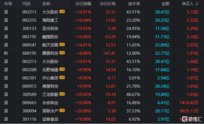 龙虎榜单日净买入额前三为海陆重工、亚光科技、融捷股份,分别为2.52亿元、2.29亿元、2.18亿元。