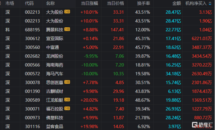 龙虎榜中涉及机构专用席位的个股中,单日净买入额前三为大为股份、宣亚国际、中富通,分别为1.90亿元、6221.03万元、3487.37万元。