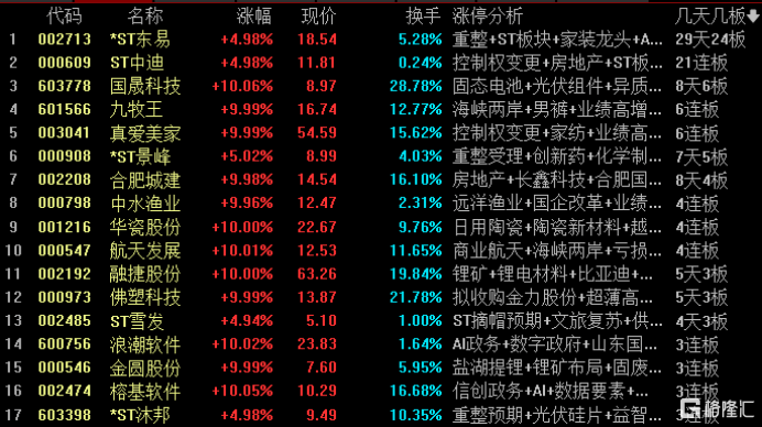 高位股方面,*ST东易29天24板,ST中迪21连扳,九牧王、线连板,浪潮软件、洛凯股份、榕基软件3连板。
